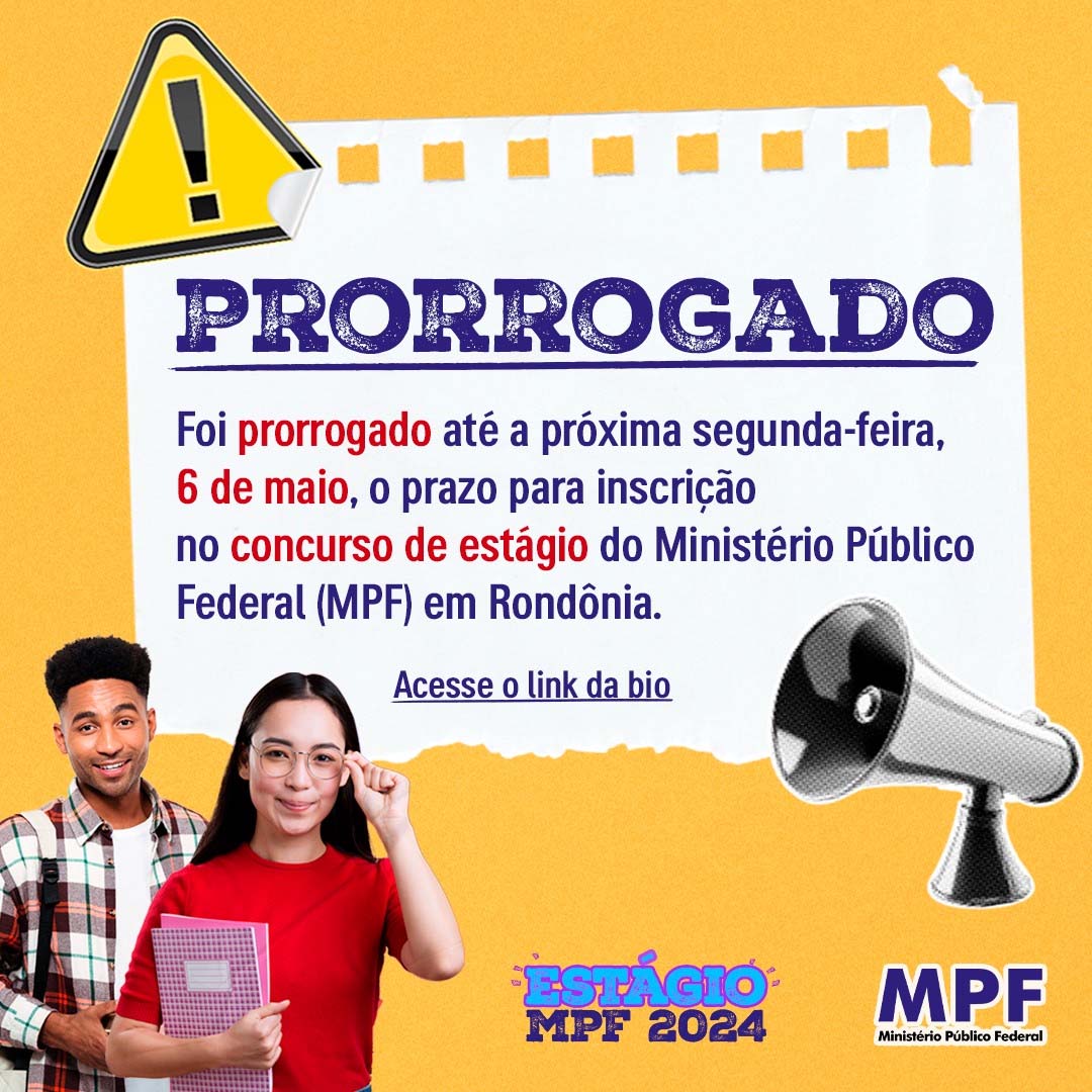 Foi prorrogado até a próxima segunda-feira, 6 de maio, o prazo para inscrição no concurso de estágio do Ministério Público Federal (MPF) em Rondônia. Há previsão de duas vagas imediatas e formação de cadastro de reserva para as unidades em Porto Velho e Ji-Paraná. As inscrições podem ser feitas na página do concurso (https://novoportal.mpf.mp.br/mpf/ro/estagie-conosco/concurso-de-estagio-2024). Quem desejar se candidatar a uma das vagas deve preencher a ficha de pré-inscrição e depois confirmar a inscrição também pelo site do concurso.
