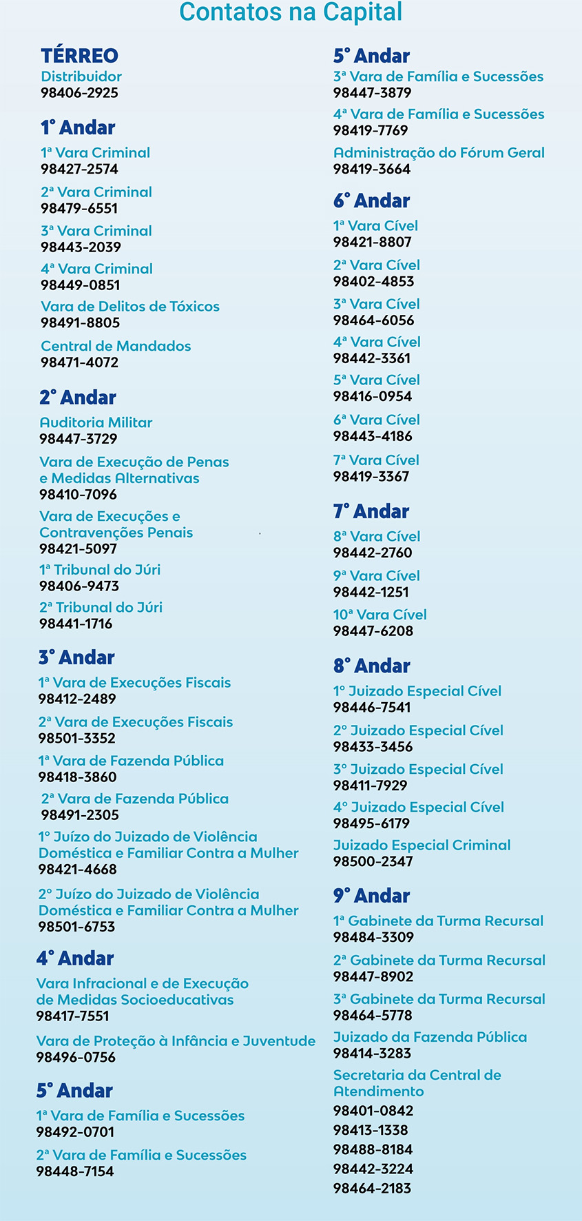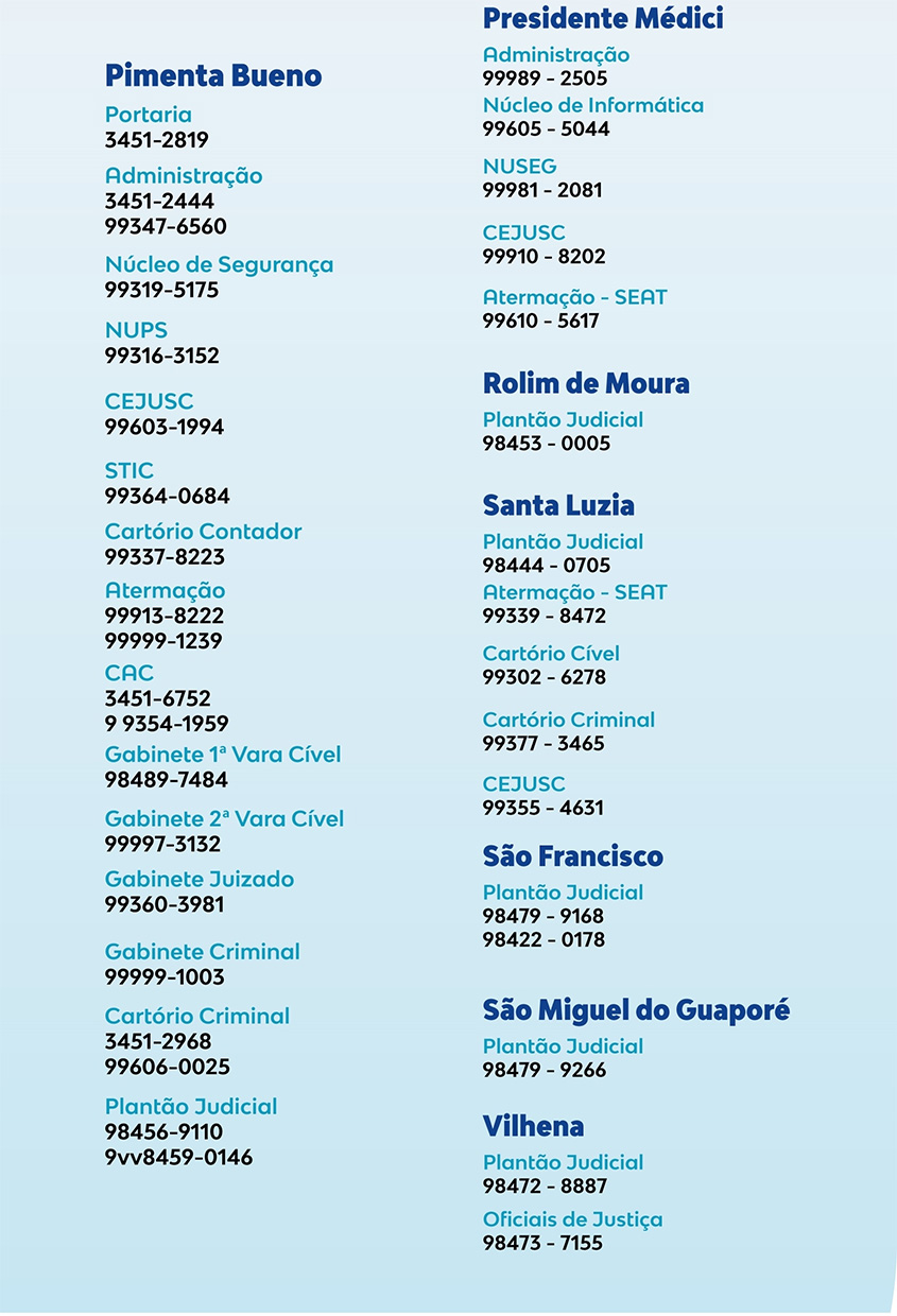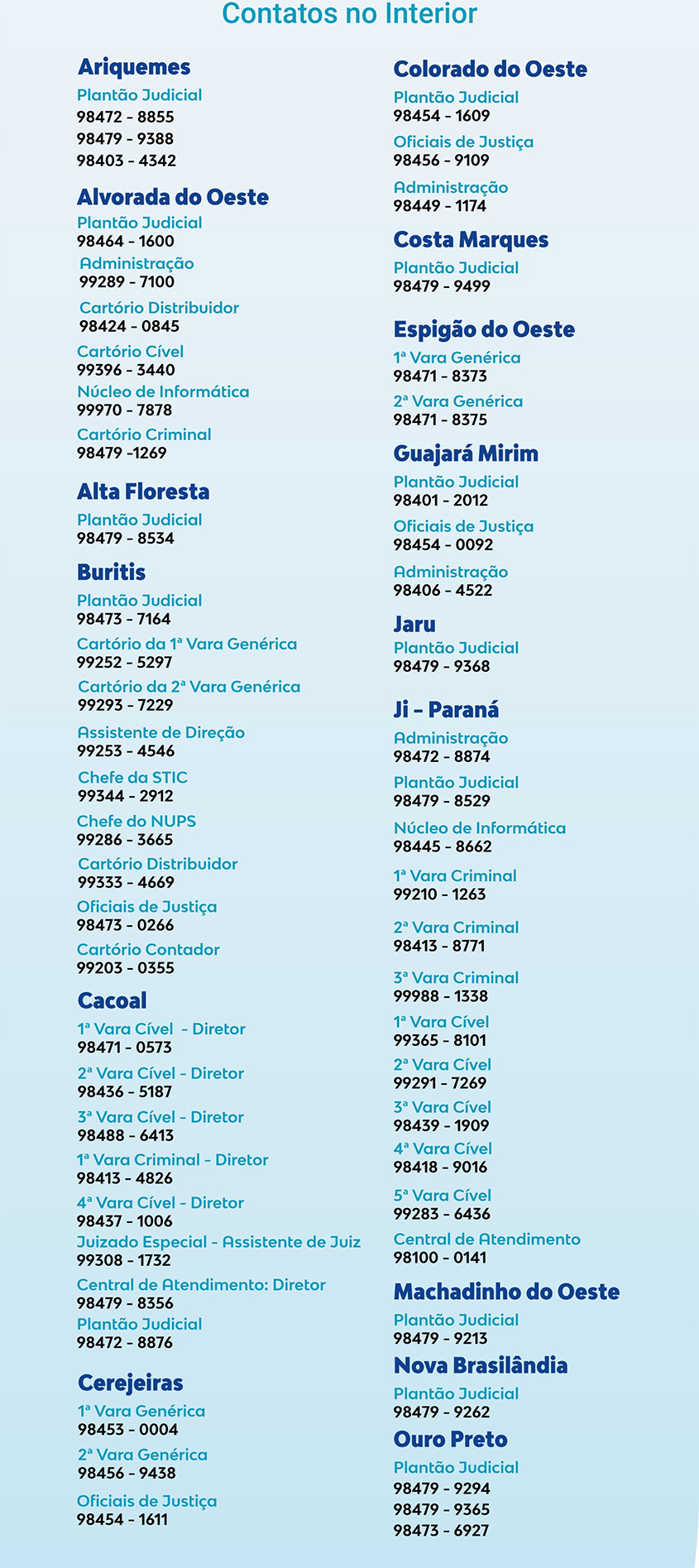 Os números de telefones de contatos das unidades, da comarca de Porto Velho e das comarcas do interior do Poder Judiciário do Estado de Rondônia, foram publicados no Diário da Justiça 058, desta quinta-feira, 27 de março.