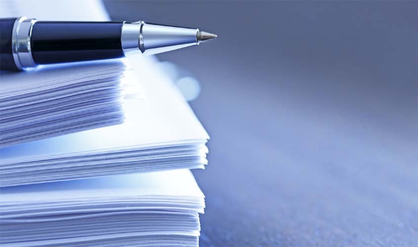 Caneta esferográfica sobre pilha de documentos