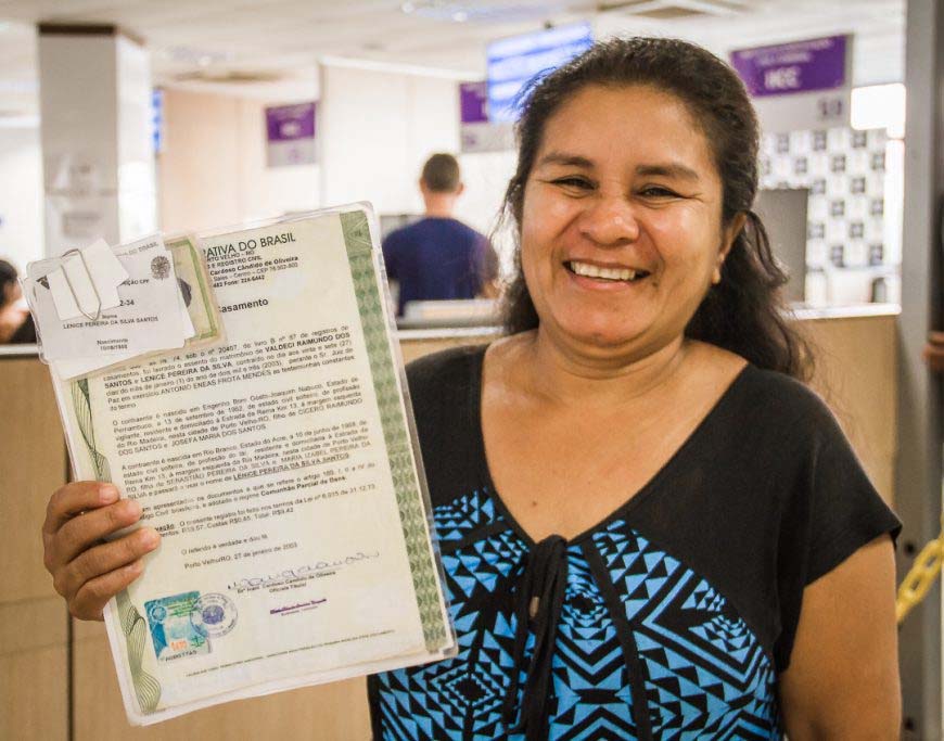 Lenice mostra sorridente os documentos emitidos no Tudo Aqui da sete de setembro