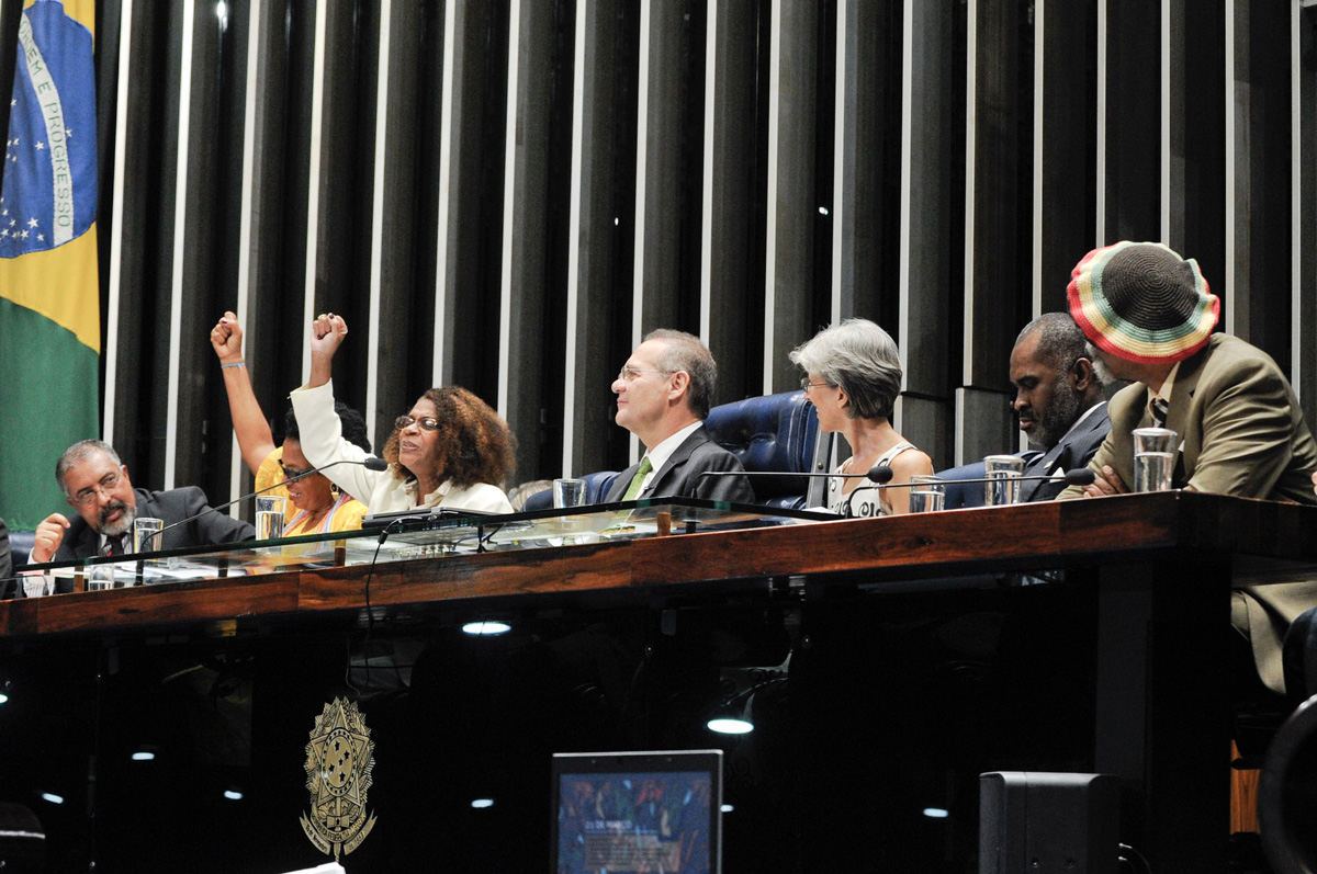 O Dia Internacional Contra a Discriminação Racial foi criado pela Organização das Nações Unidas (ONU) em 1966, em referência ao episódio conhecido como Massacre de Sharpeville. Em 21 de março de 1960, no bairro de Sharpeville, em Johanesburgo, na África do Sul, uma manifestação contra leis discriminatórias no transporte foi fortemente reprimida pela polícia, o que resultou em 69 mortos e mais de uma centena de feridos. Em 2014, o Senado realizou uma sessão especial para marcar a data e relembrar a importância da luta contra a discriminação. A sessão, que também prestou homenagem ao ativista negro e senador Abdias Nascimento, contou com a participação de diversas vozes da luta contra o preconceito racial, como a atriz Zezé Motta, de braço erguido na imagem, ao lado do então presidente do Senado, Renan Calheiros.