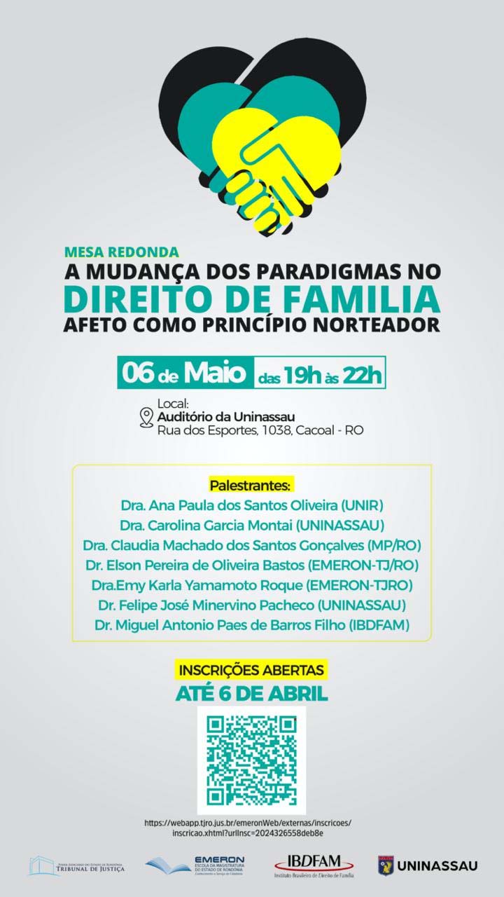 A UNINASSAU Cacoal e Rondônia, em parceria com a Escola da Magistratura do Estado de Rondônia (Emeron) e o Instituto Brasileiro de Direito de Família (IBDFAM) - seção Rondônia, realizam, na segunda-feira (6), uma mesa redonda com a participação de diversos profissionais renomados da área do direito. O tema debatido é "A mudança dos paradigmas no direito das famílias: afeto como princípio norteador".