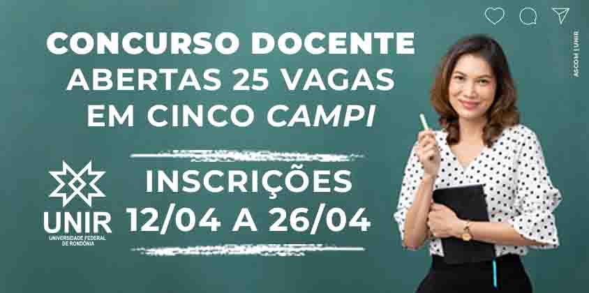A Universidade Federal de Rondônia (UNIR) abriu edital para contratação de 25 professores efetivos para atuarem em diversos cursos ofertados pela instituição. As vagas disponíveis estão distribuídas entre as unidades Porto Velho, Ariquemes, Ji-Paraná, Cacoal e Rolim de Moura, e as inscrições iniciam no dia 12 de abril.