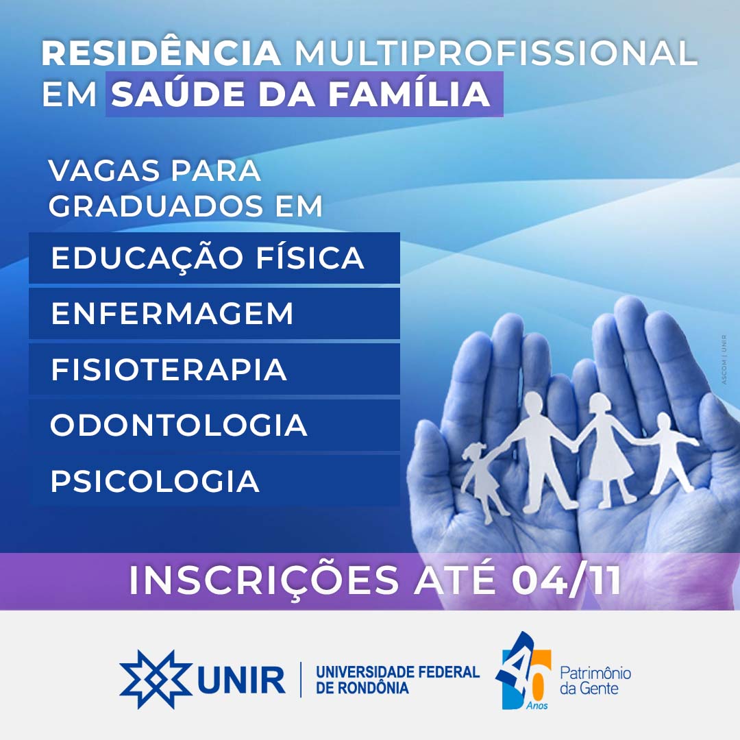A Universidade Federal de Rondônia (UNIR) está recebendo inscrições para o Programa de Especialização em Residência Multiprofissional em Saúde da Família (Remusf). As vagas disponíveis são para profissionais de Educação Física, Enfermagem, Fisioterapia, Odontologia e Psicologia, para ingresso em 2023. Os interessados podem realizar a inscrição gratuitamente pelo Sistema Sigaa/UNIR, até o dia 4 de novembro.