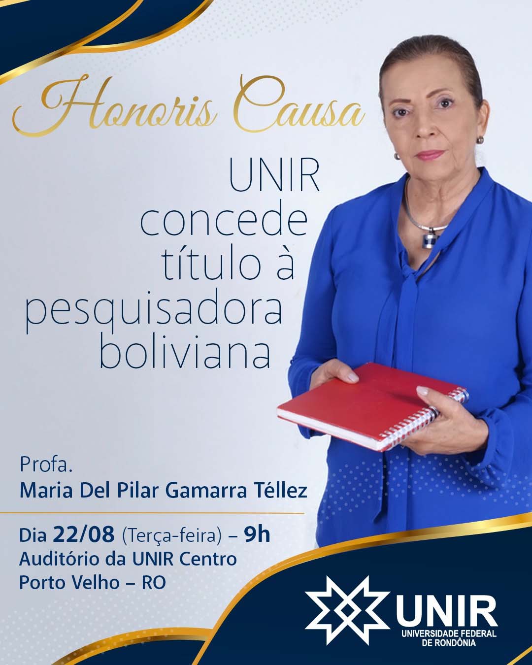 A Universidade Federal de Rondônia (UNIR) concederá, em sessão solene do Conselho Superior Universitário (Consun), o título de Doutora Honoris Causa à professora Maria Del Pilar Gamarra Téllez, historiadora boliviana reconhecida por suas pesquisas localizadas na Amazônia. A outorga do título à professora Maria Del Pillar acontece na próxima terça-feira, dia 22 de agosto, em sessão presencial do Consun, no Auditório da UNIR Centro, a partir das 9h. Como destacou o vice-reitor da UNIR, e presidente em exercício do Consun, professor Juliano Cedaro, “o reconhecimento da trajetória e às contribuições da professora Pillar decorrem tanto pelo seu trabalho de grande relevância, mas também pela necessária integração, cada vez maior, entre pesquisadores brasileiros da UNIR com colegas da América do Sul, especialmente os países fronteiriços”.