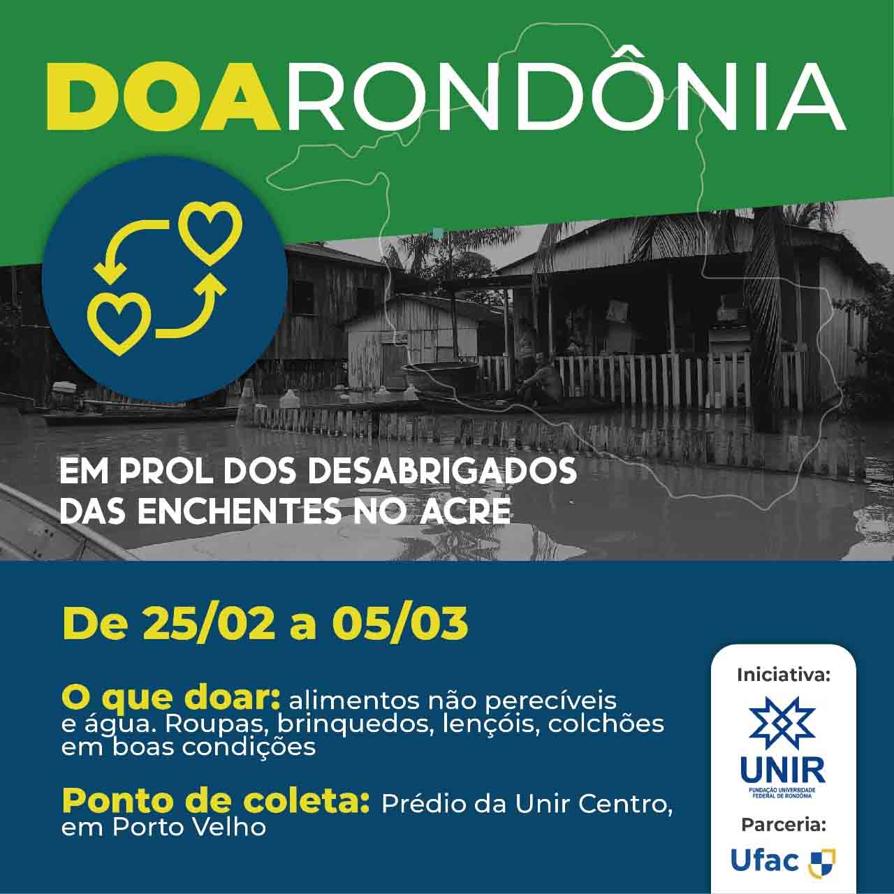 A Fundação Universidade Federal de Rondônia (UNIR) inicia nesta quinta-feira (25), em parceria com a Universidade Federal do Acre (Ufac), a campanha Doa Rondônia para arrecadar donativos para as famílias afetadas pela enchente no estado vizinho. O Acre enfrenta atualmente uma grave crise sanitária e humanitária com inundações que já afetam cerca de 130 mil pessoas, novo pico de Covid-19, surto de dengue e uma crise migratória.
