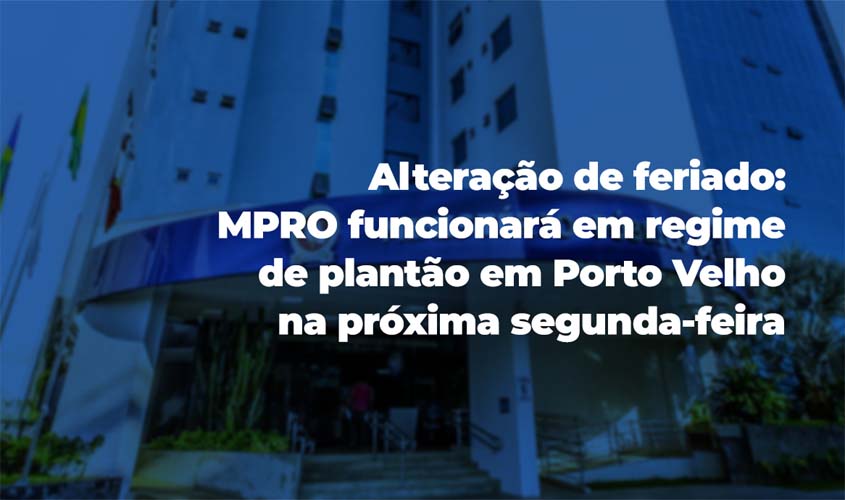 Alteração de feriado: MPRO funcionará em regime de plantão em Porto Velho na próxima segunda-feira