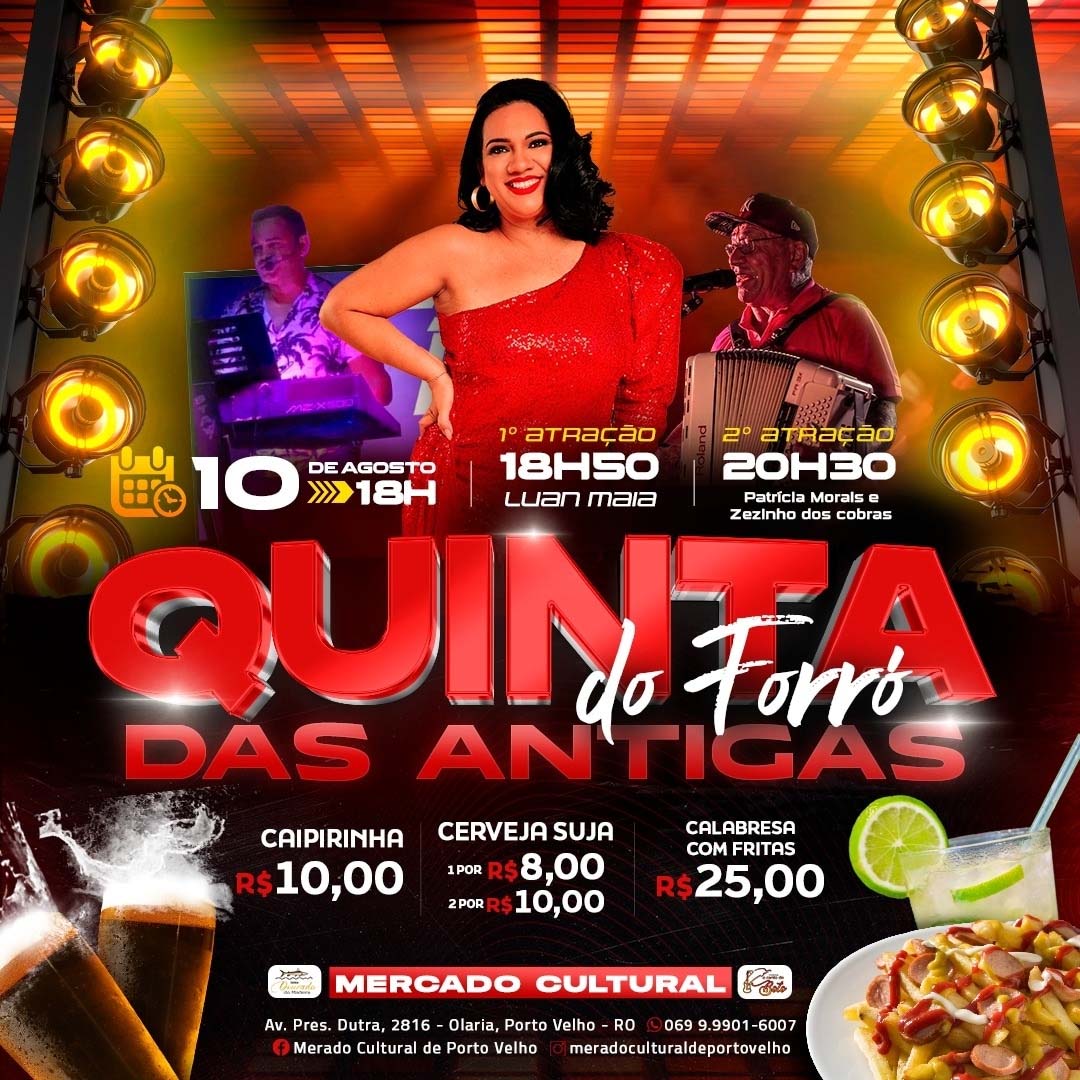 Com realizações de shows musicais de segunda a segunda, sem cobrança de entrada, couvert artístico e nem taxa de serviço, hoje, dia 10, tem a tradicional "Quinta do Forró das Antigas " com três atrações, a primeira, às 18h40, com Luan Maia, na sequência, show de Patrícia Morais e Zezinho dos Cobras.