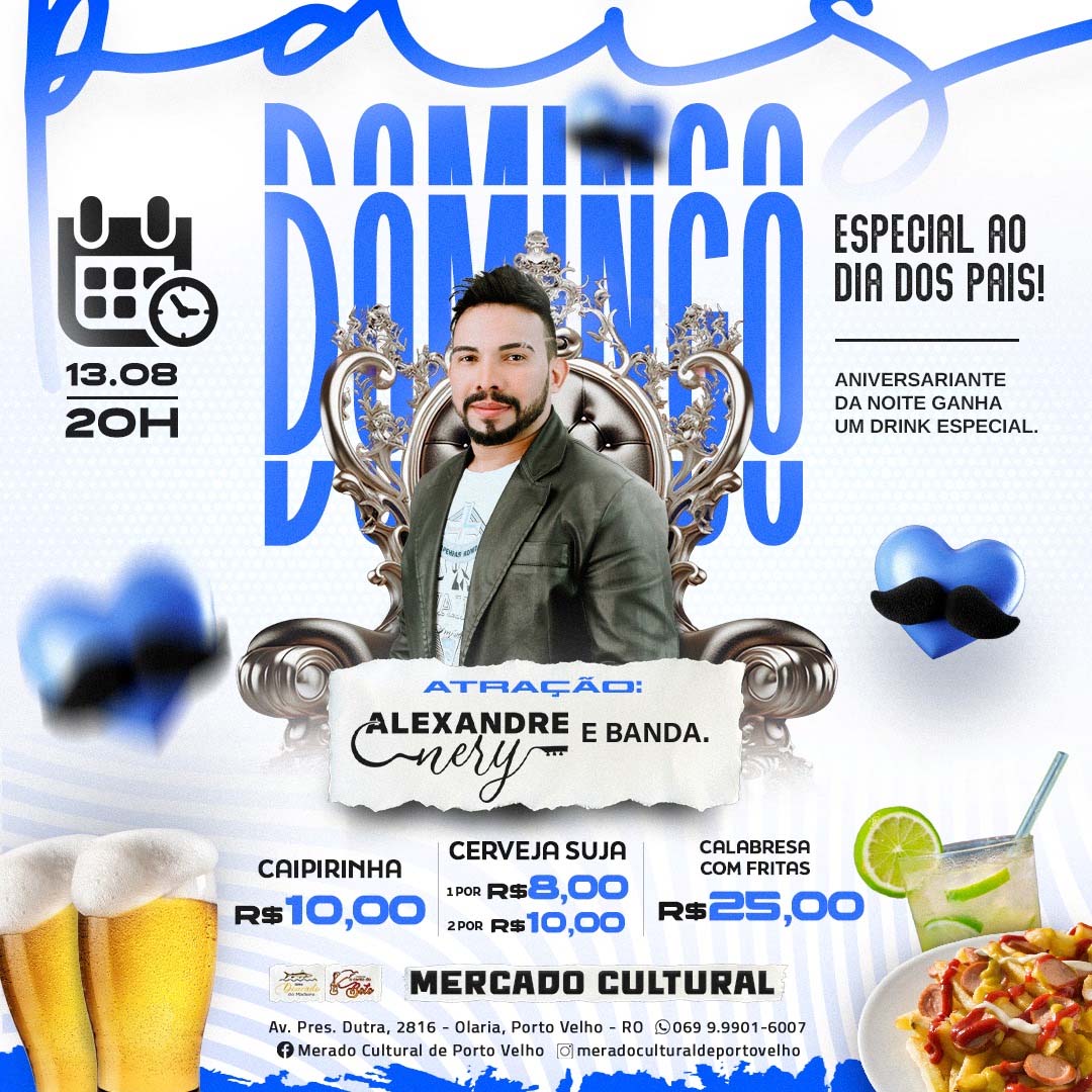 "Neste domingo, traga o seu paizão para tomar café da manhã, almoçar ou curtir um happy hour à noite aqui nesse espaço público, histórico, cultural e turístico da nossa capital rondoniense", convidou o empresário Sinezio Tapajós, permissionário do box Dourado do Madeira, localizado no Mercado Cultural de Pvh.