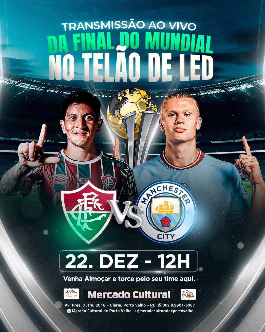 Com animação do DJ Edvaldo Gonçalves, vai ser transmitido no telão de LED a final do Mundial de Clubes da FIFA, entre Manchester City X FLUMINENSE, no Mercado Cultural de PVH.