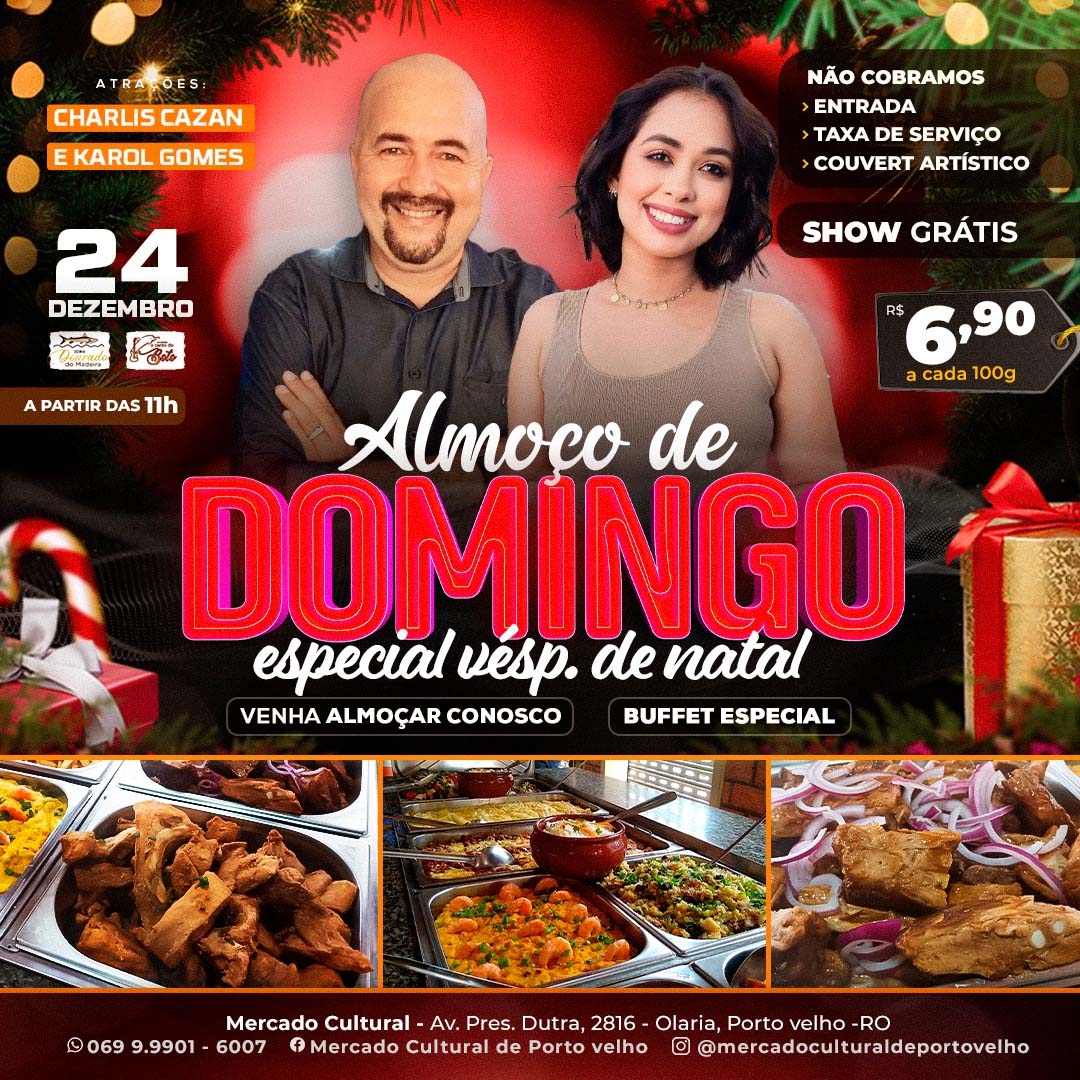 Às 12h, 'Almoço de Domingo', edição especial de Natal, com show de Charlis Cazan e Karol Gomez.
