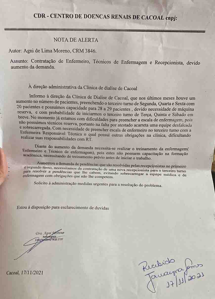 “Não há condições clínica e profissional para admitir novos pacientes, por ausência de funcionários, falta enfermeiro, ausência de cirurgião vascular para procedimento de fistulas. Pacientes estão sendo dialisados na uti do Heuro, tirando a vaga de outro paciente mais grave, por falta de investimentos de clínica TRS de Dialise por parte da Prefeitura de Cacoal” frisou Dr. Paulo.