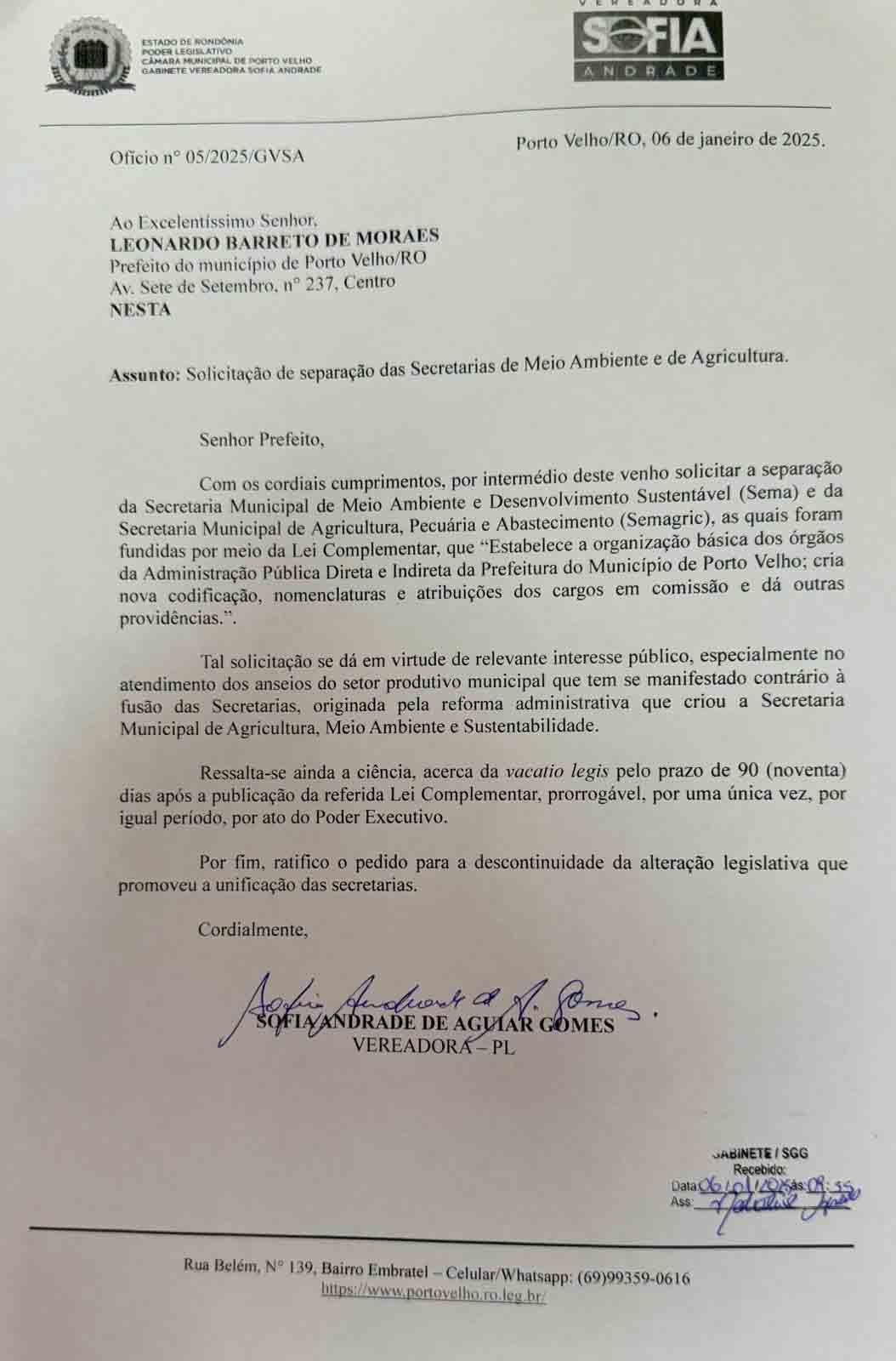Porto Velho, RO – Em uma iniciativa que visa atender às demandas do setor produtivo local, a vereadora Sofia Andrade, do Partido Liberal (PL), protocolou o Ofício n° 05/2025/GVSA, endereçado ao prefeito Leonardo Barreto de Moraes. No documento, a parlamentar solicita a separação da Secretaria Municipal de Meio Ambiente e Desenvolvimento Sustentável (Sema) e da Secretaria Municipal de Agricultura, Pecuária e Abastecimento (Semagric).
