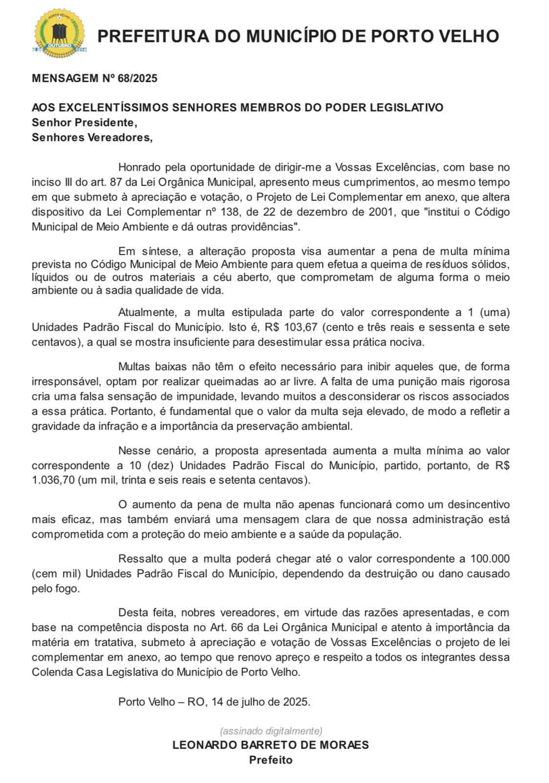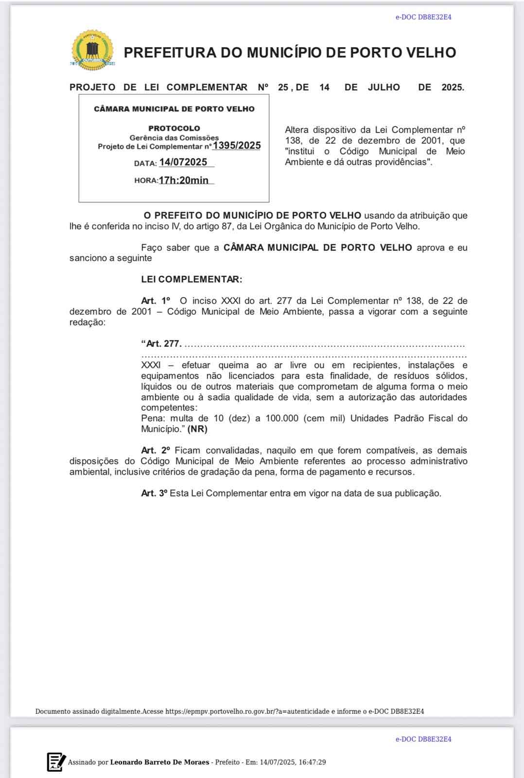 O Projeto de Lei Complementar n° 25, agora segue para ser sancionado pelo prefeito Léo Moraes (PODEMOS), o projeto foi aprovado pela Câmara Municipal e visa coibir práticas que comprometem a qualidade de vida e o meio ambiente na capital.