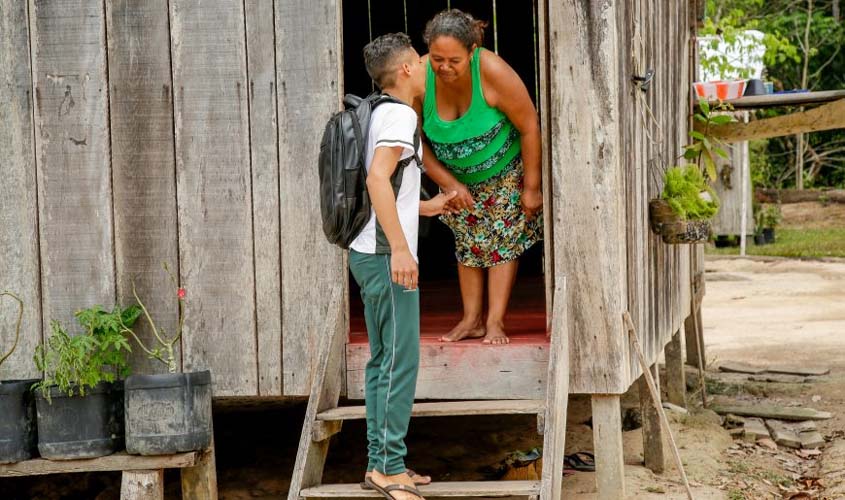 Márcio Augusto Pinheiro Alves, 15 anos, aluno do 9º ano, almoça às 12h30, se despede da avó Sônia Maria Néris, 55, e atravessa um quilômetro da floresta da Comunidade Canindé para receber videoaulas, de segunda a sexta-feira, ao lado da base da Secretaria Estadual de Desenvolvimento Ambiental (Sedam), na Reserva Extrativista Rio Cautário, em Costa Marques, a 700 quilômetros de Porto Velho.