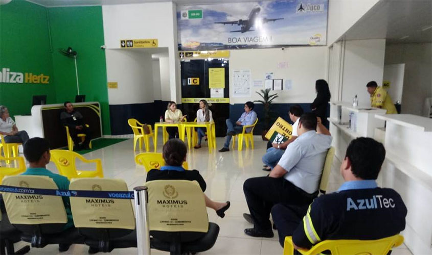 Outro trabalho realizado pelos profissionais da vigilância é a orientação e medidas adotadas no Aeroporto e na Rodoviária de Ji-Paraná. Os técnicos da prefeitura realizaram orientações junto aos profissionais que atuam nos dois locais sobre os riscos de transmissão do vírus e como abordar e orientar os passageiros em relação ao COVID-19.