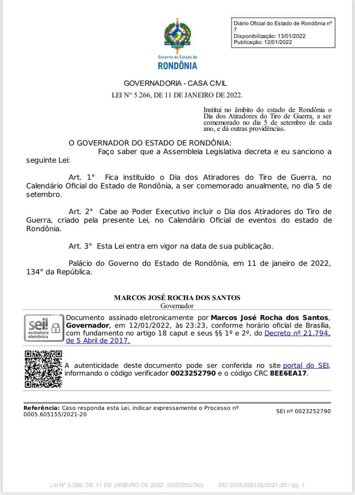VIROU LEI - De autoria do deputado Anderson, Dia dos Atiradores do Tiro de Guerra é incluído no Calendário Oficial do Estado de Rondônia