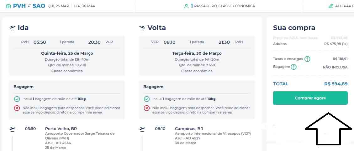 Mesmo com a pandemia de COVID-19 muitas pessoas necessitam viajar de avião. Quem está a procura de voos baratos para o mês de março não pode perder essa oportunidade. Nos voos de Rondônia para 15 destinos é possível garantir descontos. De Porto Velho para Campinas (SP) a nossa equipe encontrou passagens aéreas de ida e volta por R$ 594,89. (Confira detalhes na imagem acima). Esse voo é da Azul, companhia que oferece ônibus de graça indo e voltando para a cidade de São Paulo.