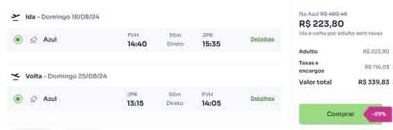 As passagens aéreas de Ji-Paraná para Porto Velho também estão sendo vendidas por R$ 339. Os voos diretos da Azul entre as duas cidades são operados aos domingos em jatos da Embraer-195 que transportam até 118 passageiros. Essa mesma aeronave realiza os voos de Ji-Paraná para Cuiabá.